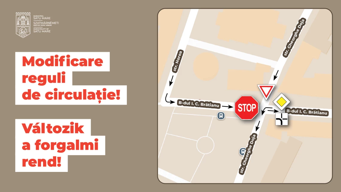 Stimați sătmăreni, vă informăm că începând de miercuri, 19 noiembrie, se instituie drum cu prioritate pe strada I.C. Brătianu spre Gheorghe Doja.